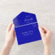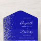 The left-hand edge of this elegant modern all-in-one wedding invitation and RSVP features a silver faux glitter border. The customisable text combines white whimsical handwriting, copperplate and italic fonts on a royal blue background. The return address appears on the outside flap and the reverse side of the detachable RSVP card in white text on solid royal blue.