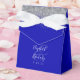 The front flap of this elegant modern wedding favour box features a silver faux glitter border. The customisable text combines white handwriting and copperplate fonts over a large ampersand on a royal blue background.