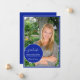 This modern, unique, minimal graduation announcement design features a customisable full-size photo on the front, surrounded by a thin white-edged royal blue frame. In the lower left corner on the front is a white-edged royal blue circle with the word, "graduate" with swashes in trendy. elegant handwritten script. Below, in simple, popular sans serif typography and chic hand-lettered script are customisable text for the graduate's name, school and graduation year. On the back is a white-edged circle on a royal blue background, with the word, "congratulations" in matching script with swashes and customisable text for further details. You can personalise this item by changing the photo and text in the product template.