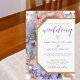 A daring geometric hexagon, rimmed with bronze, is seated in a rim of watercolor flowers in shades of lavender, royal purple and lilac along with rosy red and coral. Contrasting script and modern sans serif fonts announce the details of your wedding with selected lines in a royal purple hue that repeats in solid on the back. It is simple to switch in your details for our placeholders.