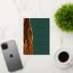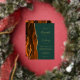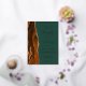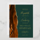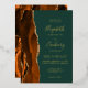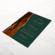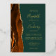 The left-hand edge of this elegant modern wedding invitation features a burnt orange and rust watercolor agate border trimmed with faux gold glitter. The customisable text combines handwriting, copperplate and italic fonts in real gold foil on a dark emerald green background. The reverse side features a matching burnt orange and gold agate design.