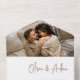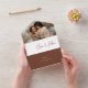 A beautiful typography based wedding invitation featuring your names in modern earth tone rust handwritten script lettering at the top. Personalise with your wedding details in classic serif lettering aligned at the lower right, and add a photo at the top. Attached RSVP card and folding style makes this all-in-one invitation an appealing choice.
