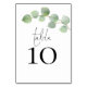 Modern Sage Eucalyptus Script Wedding. Table is set in a handwriting style script and your table number beneath with elegant watercolor foliage across the top from the right. Easily personalise the number. The same design is on the other side and will update simultaneously as you make your change to the number.