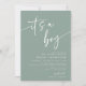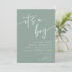 It's a Boy baby shower invitation that has a stylish minimalist design, a sage green colour palette and a modern font. This contemporary invitation is easy to edit and is perfect for a modern boho baby shower for a little boy.
