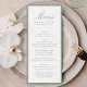 This wedding menu is styled with soft sage green calligraphy for the “Menu” heading, complemented by refined serif text for the names, date, and dining selections. The muted green border creates a calm, organic contrast against the white background, making it especially well-suited for botanical, garden, and romantic wedding themes. The airy color palette and structured layout provide a graceful way to present your reception menu while keeping the overall look light and elegant.