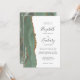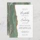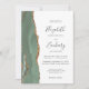 The left-hand edge of this elegant modern wedding invitation features a sage green watercolor agate border trimmed with faux gold glitter. The customisable text combines charcoal grey handwriting, copperplate and italic fonts on a white background. The reverse side features a matching sage green and gold agate design.