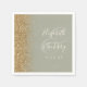 The left-hand edge of these elegant modern wedding napkins features a gold faux glitter design. The customisable text combines ivory handwriting and copperplate fonts over a large ampersand on a sage green background.