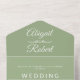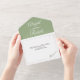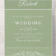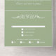 Modern sage green and white typography and small flowers all in one fall wedding invitation. It displays your names in a cursive script elegant style typography and two small white flowers with leaves on both sides of the ampersand on sage green. The RSVP can be detached.