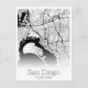 Modern black and white graphic shows outline map of San Diego, CA layout with major streets, highways and bodies of water.