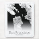 Modern graphic shows outline map of San Francisco, CA layout with major streets, highways and bodies of water.