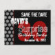 Here's a trendy save the date 3postcard in black and white with accents of red for a surprise 30th birthday party. Fun! All text is customisable.