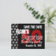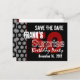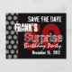 Here's a trendy save the date postcard in black and white with accents of red for a surprise 50th birthday party. Fun! All text is customisable.