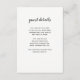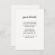 This simple and stylish wedding guest details card features modern black script typography on a clean white background, for a minimalist look that still makes a statement. You can use these cards to include information about your wedding reception, driving directions, accommodations, and anything else you need your guests to know.