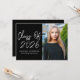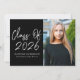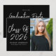 Celebrate your graduate’s achievement with these modern graduation party invitations featuring "Class of 2025" in stylish white handwritten script on a sleek black background. Personalise the front with the graduate’s name, school name, and a vertical senior photo for a custom touch. The back of the invitation presents all the essential party details in elegant white lettering on a matching black background. Perfect for high school and college graduates, these bold and sophisticated invites set the tone for a memorable graduation celebration.
