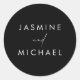 Seal your wedding envelopes with these simple and stylish envelope seals! The design features your names in modern white lettering complemented by a handwritten script with a black background. These black and white wedding stickers are perfect for sealing envelopes, adding to wedding favours, and more!