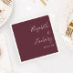 These simple, modern wedding napkins feature white text aligned to the right margin on a burgundy background. Add the names of the bride and groom in stylish handwriting calligraphy.