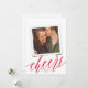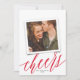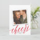 This modern yet elegant new year's photo card features a large script "cheers" in red over a classic white background with a single square photo. Over the photo is a faux photo frame image - actual design is not 3D. On the back of the card is the same white colour. **ALL colours are customisable - background colour, text colour, even the calligraphy script colour! Just click "customise design further" in the dropdown menu.**