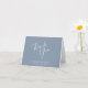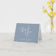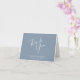 This elegant modern wedding thank you card features stylish handwriting script in white on a dusty blue background. Add the couple's names and wedding date in sans serif font.