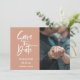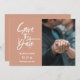Modern white script, Wedding Save the Date Photo Card. Features, chic dusty coral colour backgrounds and single photo template on front.