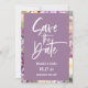 Modern white script and purple watercolor floral frame, Wedding Save the Date Photo Card. Features, chic dusty lavender colour backgrounds and single photo template on back.