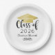 Custom paper graduation plates feature a modern and elegant personalised design with the graduate's name, their class year in trendy black calligraphy script, a gold coloured grad cap motif, and scroll accent.
