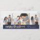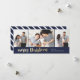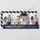 A festive photo card featuring gold merry Christmas script with three photos and a navy blue background.