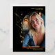 A bold, fashion-forward graduation design featuring a real gold foil handwritten script layered over a back backdrop. The arched photo window creates a modern editorial frame, giving the front a statement look that feels confident and current. The reverse side includes a multi-photo collage layout, perfect for showcasing senior portraits, beach sessions, lifestyle shots, or campus memories. The vibrant pink typography contrasts beautifully against the clean background, making this design ideal for graduates who love standout color and contemporary style.
