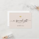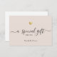A special gift for you! This modern chic gold heart gift certificate note card for your customers features hand-lettered script calligraphy alongside your names in elegant serif typography. This is the elegant blush pink version.