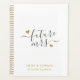 Custom-designed wedding planner notebook featuring "future Mrs" in modern stylish calligraphy with gold hearts design.