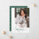 Celebrate your graduate with this modern photo graduation announcement in a green and white colour scheme. Featuring a unique photo shape with a curved edge on the front, this graduation announcement also has a bold modern script "graduate" and customisable text for the grad's name and year. The matching green back features and coordinating stripe, a second photo and customisable text for future plans, grad party invite and more. This original graduate announcement by Lea Delaveris Design is also available as a graduation party invitation and is part of a collection of graduation announcements, party supplies, decor, gifts and more. Find more styles and colours in the collection. Also available as a digital graduation announcement download!