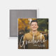 A Modern Script Graduate Simple Photo Graduation Announcement magnet with handwritten font full bleed portrait photo on the front with name and graduation details. The back is magnetic. Click the edit button to customise this design.