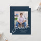 Graduation announcement featuring a modern script with a navy background. The back allows for extra wording, which could double as an invitation.