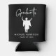 Custom black can coolers for his graduation party party featuring an illustration of a graduate celebrating in his cap and gown, "Graduate" in a modern white script and his name and class year in simple white typography.