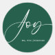 This is a simple but elegant holiday sticker using a beautiful script font in classic green and white with the word "Joy".