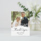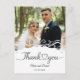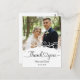 This picture is a wedding thank you card featuring a photograph of a couple, with decorative elements and text.