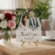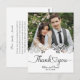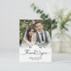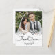 This picture is a wedding thank you card featuring a photograph of a couple, with decorative elements and text.