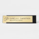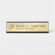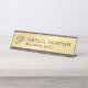 This desk name plate features monogram in black modern script font style with name and title in black professional serif font style on gold background.
