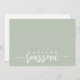 A chic personalised stationery flat note card featuring your name in a white brush script with decorative swashes on a sage green background. Modern simple elegance.