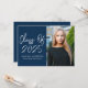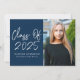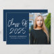 Modern graduation party invites featuring "Class of 2025" in a white handwritten script on a navy background. Personalise the front of the graduation invite by adding the graduate's name, school name, and vertical photo. The invite reverses to display your graduation party details in white lettering on a navy background.