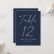 Simple, modern wedding table number cards featuring "Table" displayed in a handwritten white script with a navy background (or a colour of your choosing). To order the navy wedding table cards: add your name, wedding date, and table number. Each number needs to be added to your cart individually. After you have finished adding each table number to your cart, simply checkout and wait for your beautiful table number cards to arrive!