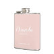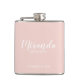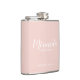 This flask features personalised bridesmaid's name in white modern script font style with title and wedding date in white modern sans serif font style on blush pink background.
