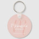 This keychain features personalised bridesmaid's name in white modern script font style and monogram in blush pink modern script font style as background with title and wedding date in white modern sans serif font style on blush pink background.