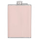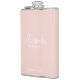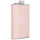 This flask features personalised bridesmaid's name in white modern script font style with title and wedding date in white modern sans serif font style on blush pink background.