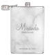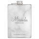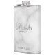 This flask features personalised bridesmaid's name in grey modern script font style with title and wedding date in grey modern sans serif font style on white marble background.