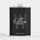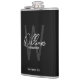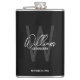 This design features personalised groomsman's name in white modern handwriting script font style and monogram in light grey modern sans serif font style as background, with wedding details in white modern sans serif font style, on black background.