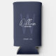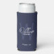 This design features personalised name in white modern handwriting script font style and monogram in light navy blue modern sans serif font style as background, with wedding details in white modern sans serif font style, on navy blue background.