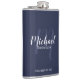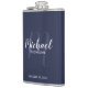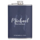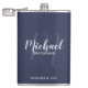 This flask features personalised groomsmen's name in white modern script font style and monogram in light navy blue modern script font style as background with title and wedding date in white modern sans serif font style on navy blue background.