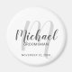 This magnet features personalised groomsmen's name in grey modern script font style and monogram in light grey modern script font style as background with title and wedding date in grey modern sans serif font style on white background.