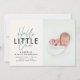 Modern script photo hello little one simple stylish birth announcement. Modern polka dot backer.