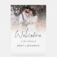 Modern Script Names Photo Overlay Welcome To Wedding. Welcome is in a set handwriting style script and easily personalise the rest of the text as required and replace the sample photo with your own. As this is a white overlay, please keep the background white so it blends with the overlay, rather than transparent.